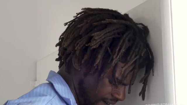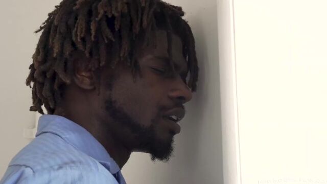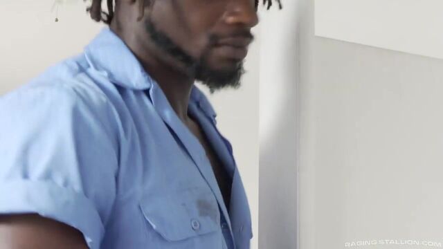 Kirk Cummings is working under a car when he notices fellow mechanic Devin Trez go into the bathroom. Kirk follows him and goes in the stall next to Devin's. Kirk watches Devin stroke his massive dick before Devin slides it thru the gloryhole and is met by Kirk's warm mouth. Thru the gloryhole, Kirk does his best to get down to the base of Devin's pole without gagging. When his mouth can't take anymore, Kirk backs up to the gloryhole and Devin slides his cock into the ass on the other side. No longer in need of the barriers, Kirk joins Devin in his stall to deepthroat the cock that was just buried in his ass. Devin is relentless with his face fucking as Kirk gags and chokes on Devin's penetrating meat. Devin rewards the struggling cock sucker with a deep tongue bath before entering him bareback once again. While Devin sits back on the toilet, Devin bounces up and down on his lengthy dick. With Kirk's hole riding his cock, Devin can't hold back any longer and blows his load deep inside Kirk's ass. When Kirk hops off to go ass to mouth, Devin's load drips from his ass. Kirk hops back on and rides Devin's pole until he strokes a hefty load that lands all over the floor.