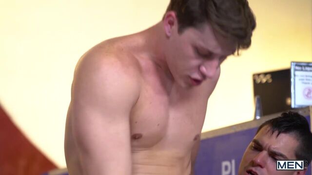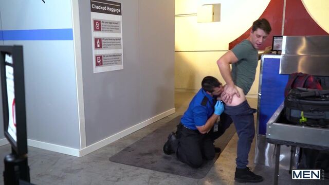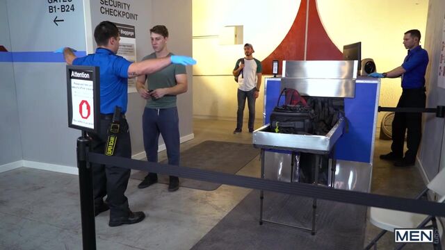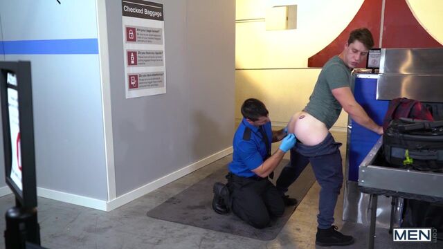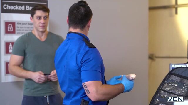 Muscular bottom Paul Canon is traveling, and decided to go on a trip with a dildo in his ass! He arrives at the airport and goes through security with beefy agent Aspen. Brown-haired Aspen thoroughly scans his lean body, but can’t seem to figure out why the scanner keeps beeping. He pulls Paul’s pants down and discovers the dildo, but instead of removing it, he slides it in and out of his tight hole, loosening him up, and making way for some hot sex.