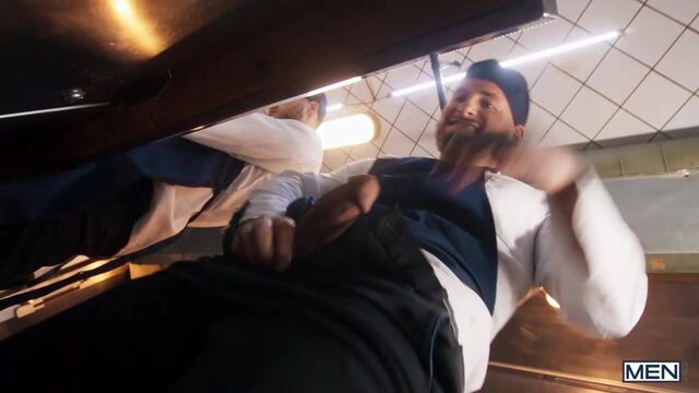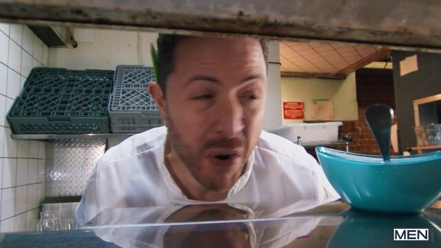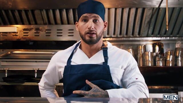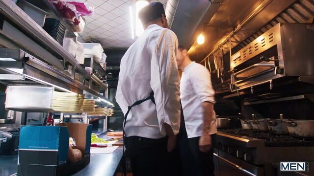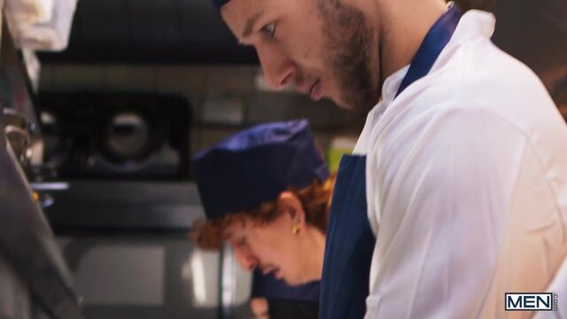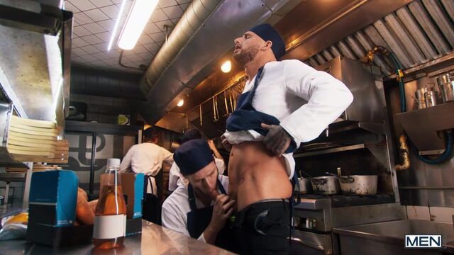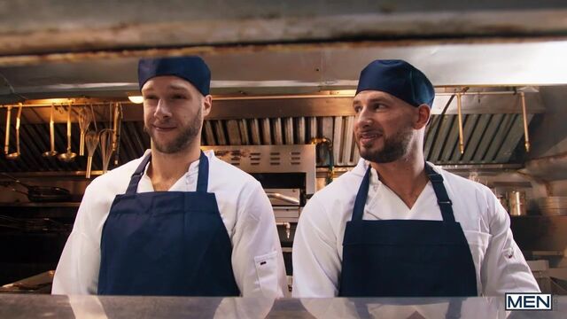 The chef de cuisine tried to put the fear of cod into his kitchen staff, but that doesn't stop cook Parker Savage from pranking his hot coworker Arno Antino with his dick in a basket of sweet potatoes! Arno thinks Parker's cock looks pretty tasty and gets to his knees for a sneaky kitchen BJ. Parker's distraction ruins the vinaigrette and gets him fired, and Arno decides to walk out too so they can keep fucking! They find a deserted spot in the back of house where Parker bends Arno over and fucks him from behind, then the bottom rides Parker. The top drills Arno on his back till he orgasms, then sauces his face.
