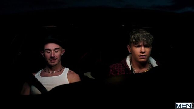 The sun sinks low over the distant hills as Drake Von cruises through the desert. He's not going anywhere in particular, so he pulls over to pick up hitchhiker Phoenix Leo. As the night sets in, the guys talk about what brought them to the desolate highway, and the hitcher senses the driver's need. Phoenix compliments the hunk, checking him out, then has Drake pull over so he can flaunt his ass in the beam of the headlights. Drake submits to the temptation, pulling out his big cock and teasing the bottom's ass, then penetrating him. Phoenix sucks the top, and Drake drills him from behind. Only the road is a witness as Drake pounds Phoenix on the car till he cums, then the bottom gets to his knees on the gravel for a facial.