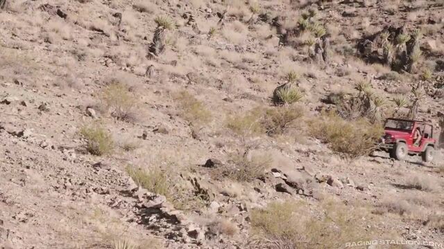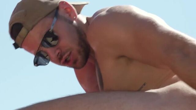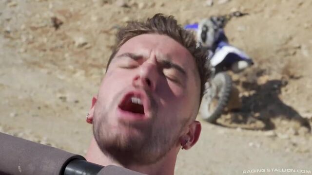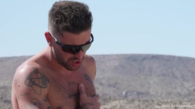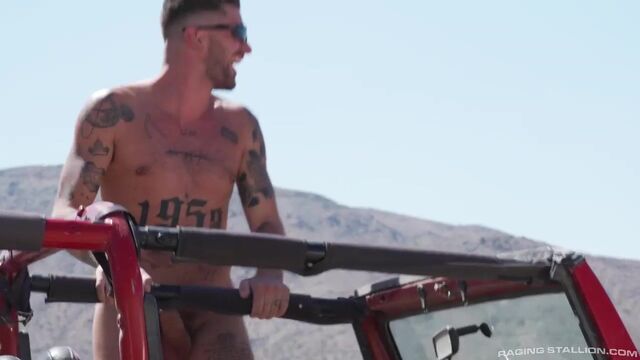 Chris Damned and Dante Colle are out in the middle of the desert off-roading. When they get to the end of the trail, the testosterone is racing through their veins and they waste no time deepthroating each other's cocks under the scorching sun. Dante hikes his legs up on a tire, giving Chris easy access to dive in and rim Dante's hole. After lubing up Dante's ass with spit, Chris slides his sizable manhood deep into Dante. Enjoying every stroke, Dante takes it in strides before switching it up and jumping on to ride Chris' thick cock bareback. The sun burns down on the tatted studs and Dante gets his ass stretched. Switching positions, Dante lays in the passenger seat and lets Chris fuck a load out of him that glazes his abs. Chris pulls out and shoots thick ropes that cover Dante's cock.