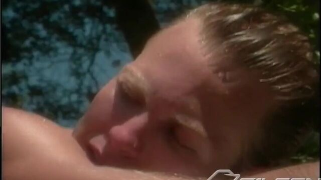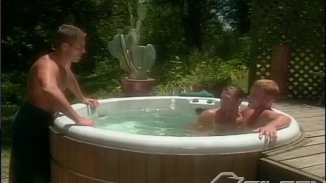 Steve O'Donnell invites the reluctant Logan Reed to join him in the hot tub with Derek Cameron. Logan gladly jumps in and the two men devour the blond adonis with gusto. With Derek sandwiched in between, sucking Steve's hard cock as Logan moves in from behing, licking and eating his ass. Steve and Derek alternate sucking and getting sucked, then Derek begins sliding up and down Steve's pole, as Logan works his throbbing tool. The action continues outside the hot tub with Derek riding Steve's cock while Logan watches. The fucking intensifies and all three men shoot their loads.