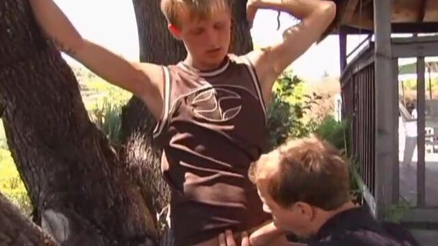 One a recent sunny Californian day, Skyler and Issac Conn were goofing around outside while their lady friends were gone. As Skyler was climbing down from a nearby tree, Issac went for the kill and pants his buddy. Seeing his friends huge cock really got him in the mood to have something long and hard in his mouth, so he went for it, and began sucking on Skyler's massive pole.Skyler let it slide for a few seconds, but then he got uncomfortable with one of his best friends blowing him, so he pushed Issac away and pulled up his pants. Fast forward a few minutes and Skyler's still hard cock was begging for a release so he finally gave in and let Issac blow him. He also decided that he might as well pound Issac's ass before blowing his load.Enjoy!