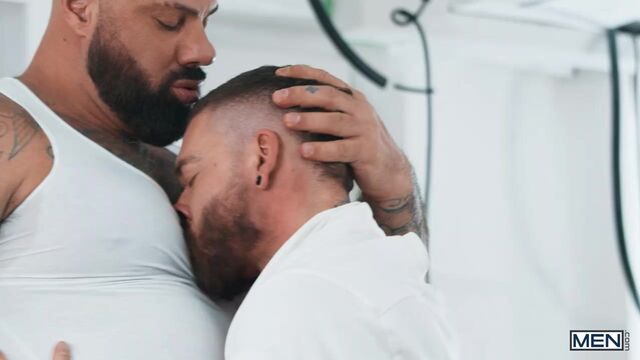 Welder Alex Marte sees construction worker Kinkoer up on a ladder with his ass at perfect ogling height, and Kinkoer beckons his beefy coworker over! The strong, tattooed guys kiss and touch each other, and Alex nuzzles the bottom's butt through his jeans before ripping them open to play with Kinkoer's hole. Alex drills the bottom, and Kinkoer swallows the top's dick and rubs it between his socked feet before getting fucked doggystyle. Alex sucks Kinkoer's pierced cock, then pounds him on the work bench till he cums. Kinkoer catches Alex's load on a leather glove and licks it off!