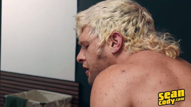 Mu just finished his workout, and as he and Ryan chat in the locker room, Ryan notices Mu must have got some squats in, because that ass is looking good enough to eat! Mu strips down to his jock strap and gives the top a taste, and Ryan penetrates the bleached-blond hunk from the back, then in missionary with his legs up. Mu rides the top, and Ryan pounds him till he pulls out for a facial, then plays with the bottom's nipple and hole as Mu strokes himself off.