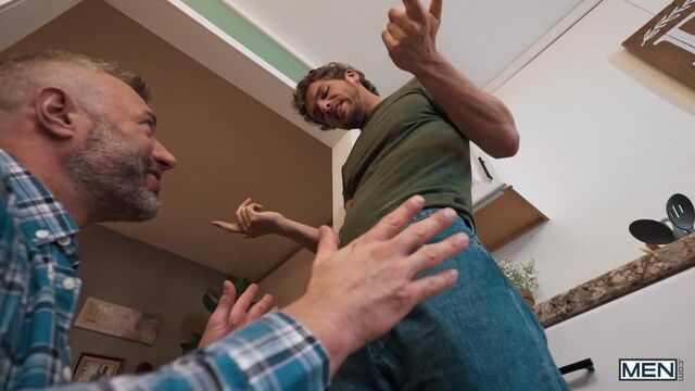 Bunker and his BF Joey Dane are making out on the couch. Joey wants to go further, but Bunker's worried about getting caught by Joey's new stepdad. But when Bunker shoots a huge load on his guy's shirt, Joey leaves to clean up... and Bunker gets his dick caught in his zipper! As he's trying to get unstuck, Joey's stepdad Cole Connor offers him some help, and tries everything, including sucking Bunker before the zipper will go down. Bunker's boner is up, so the guys go to the bedroom, where Cole fucks Bunker's face, and they 69. The daddy tongues Bunker's hole, then slides his cock inside. Bunker sits on the top's cock, then gets fucked in spoon position. The bottom cums as his BF's stepdad drills him in missionary, and Cole licks it up, then gives him a facial.