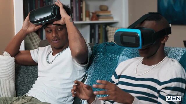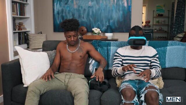 Ty Santana and Kai try to get a threesome happening during movie night with Kai's hot girlfriend, but she shuts them down. The guys are still horny, so as they play a VR game, they start jacking off. When the girl finds a double-ended stroker in the bathroom, she brings it to Kai and tells him to have fun, and he puts it to good use! He and Ty "spit-roast" the toy, then Kai bends over to get fucked. Kai rides the top, then takes it piledriver after the guys lick each other. The bottom orgasms as his buff roommate drills him on his back, and Ty cums on his face!