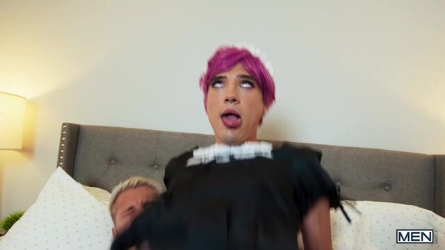 Femboy maid Andy Adler is extra horny today when he shows up to clean Filou Fitt's place, doing everything he can to seduce his hot client. Filou tells the maid he can get it out of his system by jacking off on the couch, but Andy bends over and soon convinces Filou to call off work and fuck him instead! The devoted maid cleans Filou's cock with his mouth, then gets penetrated from behind in spoon position. Filou takes the femboy to the bedroom and pounds that hole, then the maid rides him. Andy cums as Filou drills him from behind, then takes a facial. Time to clean up the cum!