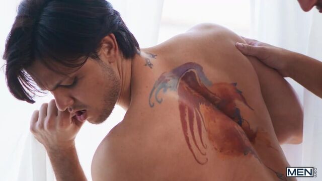 A quiet morning with his coffee takes a sensual turn as Enzo Muller's lover Arno Antino starts kissing his neck and stroking his ass. The guys grind their hard-ons together as they kiss, sucking each other before Arno puts Enzo up against the window and licks his hole. Arno penetrates the bottom from behind, then Enzo rides his BF on the floor before fucking his face. Enzo swallows Arno's cock, and shoots an impressive distance as Arno drills him on his back! The top licks it up, then cums on Enzo's face.