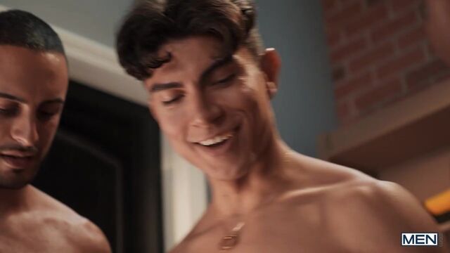 Alfonso Osnaya overhears the hottest guys in college, Ty Santana and Zayda, talking about hookups in the locker room, and he steals their underwear and sniffs them while they shower. The studs catch him and tell Alfonso to take off his shorts... revealing his caged cock! Alfonso sucks the tops, then takes his cage off to free his boner as the guys take turns fucking his mouth and rimming his hole. The guys form trains, and Alfonso even fucks Zayda before getting drilled on his back till he cums, then taking two facials in a row.