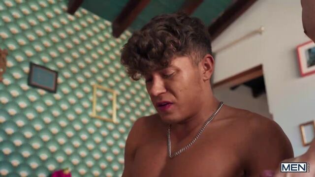 Vacation sex is always the best, so Men brought hotties Dom King, Drake Von, Jake Preston, and Hazel Hoffman south for fun in the sun and a romp in the room. Bottom Hazel offers himself up to the three tops, who are hard and ready to share his holes. Hazel sucks Drake and strokes the other guys as Dom fingers his hole till he's ready. Dom starts things off, penetrating him from behind. Next, Hazel rides Jake before getting fucked by Drake in missionary until the top is the first to cum. Hazel bends over, orgasming as he takes Dom and Jake's loads.