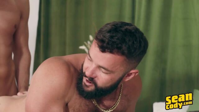 Oliver and Hayden are dressed for summer as they make out in the bedroom, and soon they're undressing as the heat rises. Hayden goes down on Oliver before the clean-cut top licks the bearded bottom's hole and penetrates him from behind. Hayden rides the blond, then gets drilled on his back till he shoots a thick load, and Oliver licks it up before covering his hairy chest with more cum.
