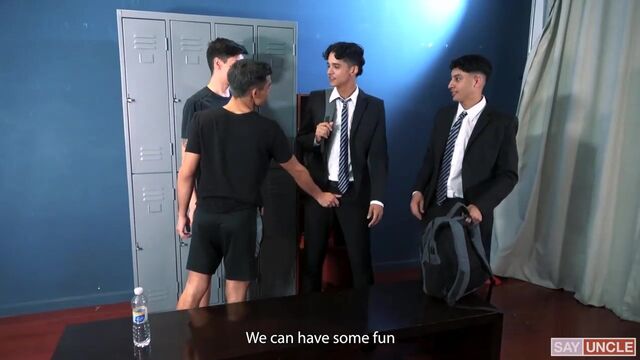 Both of them are good students so they wouldn't skip class without a valid reason, but when the offer is a foursome with two horny jocks, who could say no? Listening to their teacher is interesting, but it wouldn't feel as good as taking turns sucking three big cocks and getting their ass pounded so hard they know anyone at school could hear their moans. Sure, the downside of fucking in the locker room is that they can get caught, but that would only make their dicks harder. If anyone wants to watch, they can. They'll be fucking each other's brains out either way.