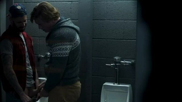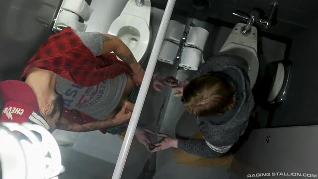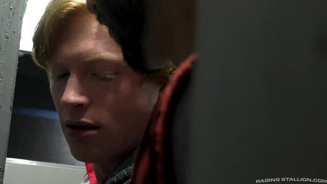 Romeo Davis is cruising at the urinals of the public restroom when Kyle Connors slips off his wedding band and notices Romeo's throbbing uncut member. Kyle quickly reaches over to grab a hefty handful. For a little more privacy, they each enter a separate stall and use the gloryhole. Romeo slides his dick through, and it's met with Kyle's warm, wet mouth. Kyle proves he's a hungry little cock slut as ropes of spit hang from his chin and Romeo's cock. When Kyle's throat needs a break, he slides his cock through the hole to let Romeo return the favor. After sucking on Kyle's meat, Romeo wants hole, so Kyle backs up as Romeo's inches disappear inside Kyle's ass. Kyle wants to feel the fullness of Romeo's cock, so he joins Romeo in the stall and braces on the toilet while Romeo pounds him bareback from behind. Switching positions, Romeo sits down on the toilet and Kyle sinks down on the fat cock and rides it hard. After bouncing on Romeo's cock, Kyle bends over one last time to get his load pounded out of him. It lands all over the floor. Romeo follows, delivering a heavy load to Kyle's face and mouth.
