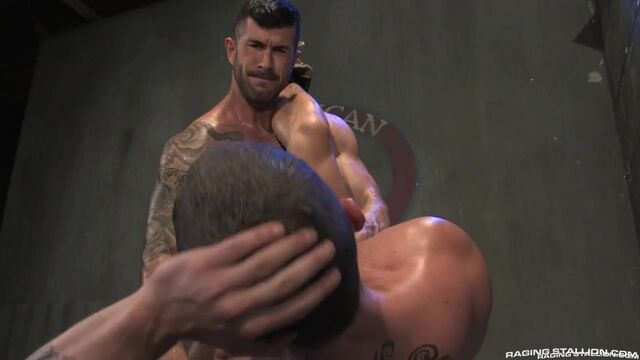 Adam Killian and Tyler Wolf stand, bare-chested with the top button of their jeans undone. They're both muscular and sculpted. Tyler is applying the sandpapery stubble of his 5 o'clock shadow to Adam's unwaxed torso, working his way south, to where a rigid hardon awaits him. Tyler's full attention to Adam's thick cock causes Adam's head to jerk and his eyes to widen and roll back in ecstasy. Adam is a male ass specialist and the work of his lips, tongue and fingers on Tyler's hole make Tyler squirm and moan before surrendering his amazing ass to Adam for a robust fuck. Adam's multiple-angle entries ensure that Tyler's hole gets a maximum workout. They both break out in full-body sweats. When Tyler starts to cum, Adam catches the jism in the palm of his hand and feeds it to him, with a bonus serving on his own hefty load.