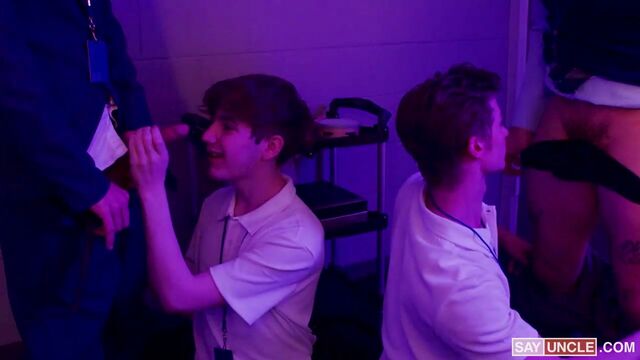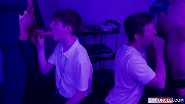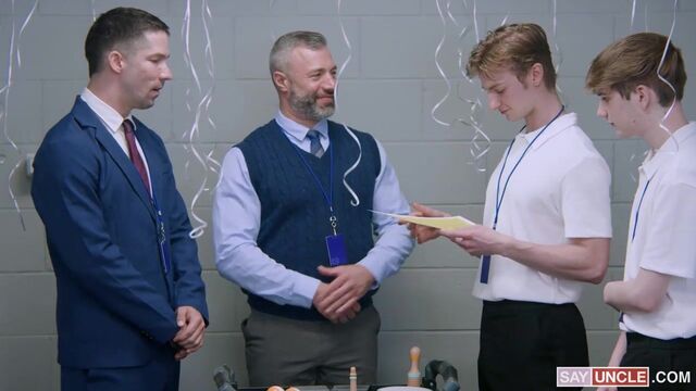 Sexerance (Part 5 of 5): During a dance party at work, the truth comes to fruition. The party turns sexual fast, with blowjobs and hard cocks everywhere you look. But with the flip of a switch, Gage and Nicholas draw the connection between their innie and outie - Cole and Eddie are, in fact, their stepfathers. Cock in mouth, Gage can’t believe Cole is his stepdaddy, and what they’re doing is wrong on so many levels. Yet, seeing the studly, experienced men, pants down and cocks exposed, the twinks can’t help but feel taken by desire. If they’ve gone this far, why not just go all the way? They move to the table, where Gage and Nicholas can get their tight little twink holes stretched out. They’ve never been fucked so good in their lives, and they don’t want the party to stop. Eddie wants his turn with Gage’s hole, and Cole feels the same way about Nicholas. They trade their loving twinks and stretch their assholes out even more. With cum on their chest, this party officially comes to its close.