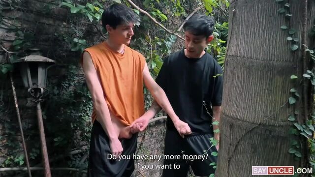 After a kinky first encounter, Dylan Sins starts frequenting Dylan Segundo’s cruising spot more and more often in the hopes of bumping into his new fuck buddy. Fortune smiles at him as he notices a familiar face hidden behind a tree while rubbing his crotch. The two Dylans meet once again, and this time, there’s no holding back. Dylan Sins is desperate to savor his mate’s cock this time, gagging himself with Dylan Segundo’s meaty dick without any restraints. Horny as fuck, Dylan Segundo gives his friend a new blowjob, making his kinky side show up. Feeling aroused and wild, Dylan Sins begs him to drill his tight little hole out in the open where anybody can see them. Dylan Segundo obeys and pounds Dylan Sins’ ass by the tree. After a nice plow, the Dylans decide to switch so that Dylan Segundo can get his hole fucked as well.