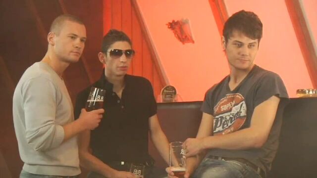 The final scene sees events turn full circle, as the action returns to the bar for another group effort – on this occasion focusing on the “Emo-esque” talents of blond cock-hunter, Nick Deniels. Fact is, he’s gagging to be at the receiving end of some wicked dick action, right from the moment he walks into the room and provocatively whips his knob out to piss on a nearby coffee-table. It’s an act that (quite rightly) gains the full ire of the other boys in the room (Falco White, Clode Volf, Tom Hyde and Carl Baxter), who immediately ask the fellow to the floor and vent their fury by drenching his face with the golden nectar. For Volf and Baxter, however, there’s still plenty of fun to be had even after the last drops of piss have been spilled, as they ask Deniels down onto a nearby sofa and begin to give his body the sort of attention that it richly deserves. Volf, as always, is a fantastically passionate top, and neither he nor the comely Baxter is satisfied until their prey is being spit-roasted at the end of their meaty, uncut cocks. It’s the kind of spunk-inducing show that’ll have you jerking on your own rods like fury – not least of all when Volf spurts over Deniels’ face and Baxter unburdens his heavy load into the young bottom’s ass! In a word, magic!