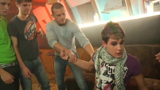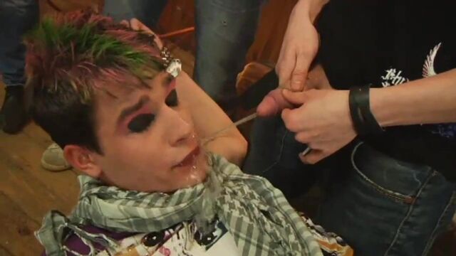 - Description: The final scene sees events turn full circle, as the action returns to the bar for another group effort – on this occasion focusing on the “Emo-esque” talents of blond cock-hunter, Nick Deniels. Fact is, he’s gagging to be at the receiving end of some wicked dick action, right from the moment he walks into the room and provocatively whips his knob out to piss on a nearby coffee-table. It’s an act that (quite rightly) gains the full ire of the other boys in the room (Falco White, Clode Volf, Tom Hyde and Carl Baxter), who immediately ask the fellow to the floor and vent their fury by drenching his face with the golden nectar. For Volf and Baxter, however, there’s still plenty of fun to be had even after the last drops of piss have been spilled, as they ask Deniels down onto a nearby sofa and begin to give his body the sort of attention that it richly deserves. Volf, as always, is a fantastically passionate top, and neither he nor the comely Baxter is satisfied until their prey is being spit-roasted at the end of their meaty, uncut cocks. It’s the kind of spunk-inducing show that’ll have you jerking on your own rods like fury – not least of all when Volf spurts over Deniels’ face and Baxter unburdens his heavy load into the young bottom’s ass! In a word, magic!