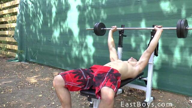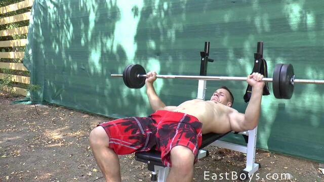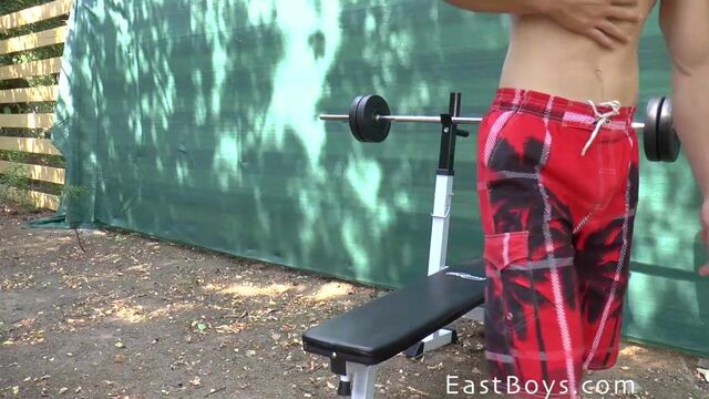 Dick Casey aka Andre Aston came for a quick visit, to show his gains and show his massive muscles! He enjoys having bench outside where he can pump up so he can better flex his body for us. Awesome to see his pecs jump, following a quick shower outside and full nude. Muscle lovers enjoy!