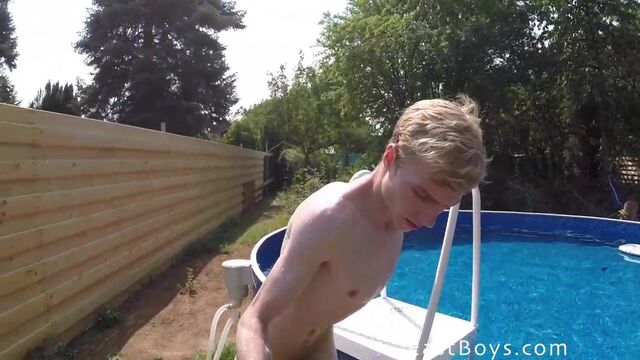 Erik Franke, the golden boy with golden cock is here to entertain us again. First having fun in the pool, then in the RV, where he is getting his first handjob! Our producer gently strokes his cock until it gets hard like a rock, while Erik is helping the action stroking his chiseled abs. Action culminates with massive cum all over hands of our producer, do not miss that! Finally Erik will take shower outside.