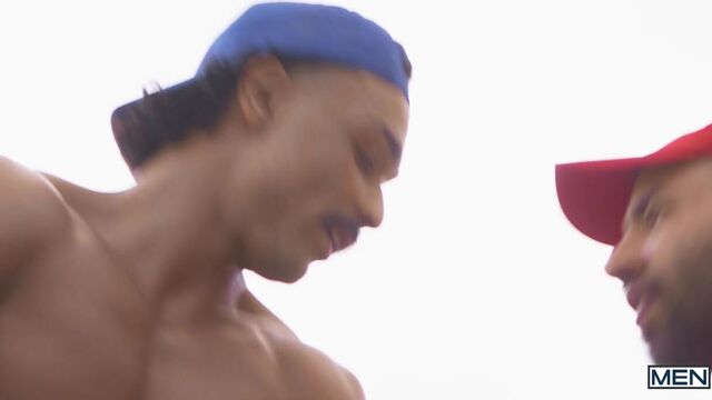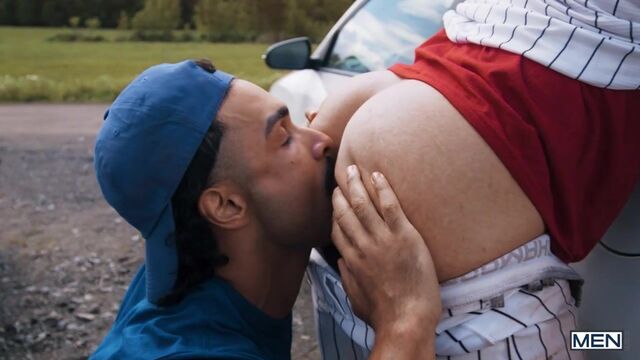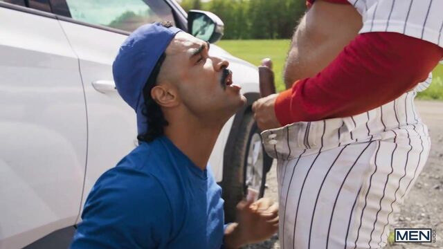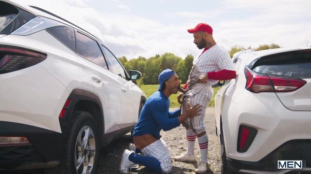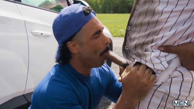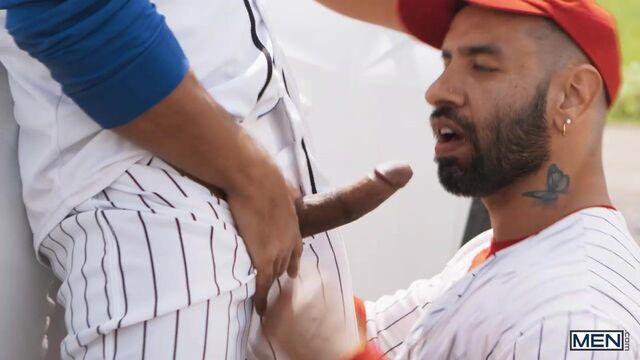 Mateo Zagal's team is up by ten runs when he comes up to bat. He playfully trash-talks catcher Diego Silva, then hits a home run that ends with him sliding into home--and into Diego's crotch face-first! Disappointed by the loss, Diego stalks off, and Mateo follows to make up. He finds Diego rubbing his bulge, and reaches in to pull out his cup, then sucks him. It's Mateo's turn to be the catcher as Diego rims him and pounds him doggystyle in the parking lot. He rides the top till he orgasms, then catches Diego's load in his mouth.