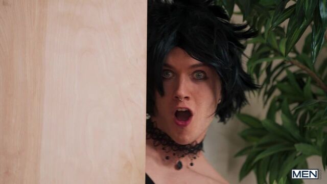 Emo femboy Finn August doesn't even glance at his roommate's jock boyfriend Joey Dane when he shows up horny after wrestling practice. Joey's GF has to go to class, and Finn appears to ignore him, but follows Joey to his roomie's bedroom and watches him jacking off, touching himself under his plaid skirt. Joey notices the femboy and tosses him on the bed, fucking his throat! He bends Finn over and tugs out his skull butt plug, licking his hole, then fucking him hard in doggystyle. Finn rides the top, then makes ahegao faces as the jock drills him on his back till he orgasms, and Joey creampies him.