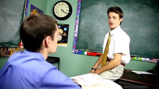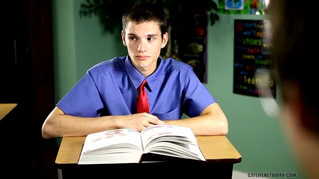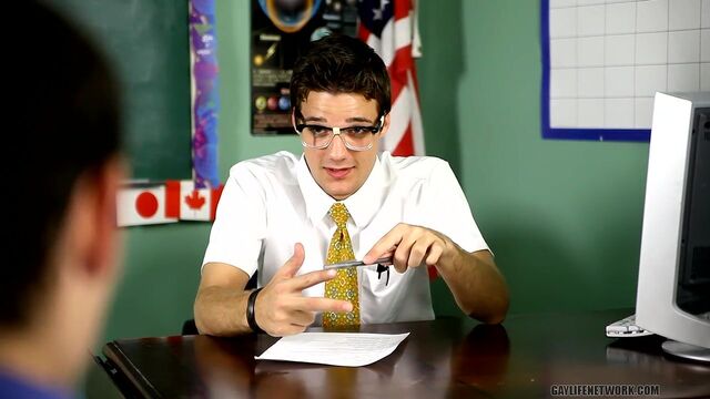 Krys Perez is a disciplinary professor in this unbelievably hot scene. His student Adam Scott has plagiarized and is terrified of being expelled. He has to find a way to convince his professor not to get him in trouble and it seems the only way to do that is to get on his knees and put Krys' cock in his mouth. The Prof takes full advantage and has his naughty student bent over and taking it. What a hot fantasy!