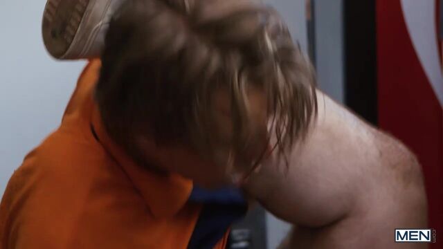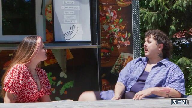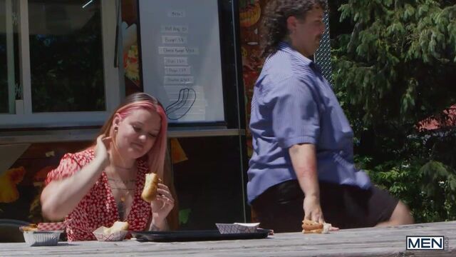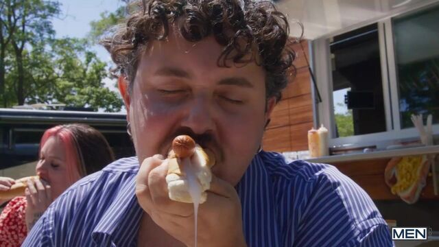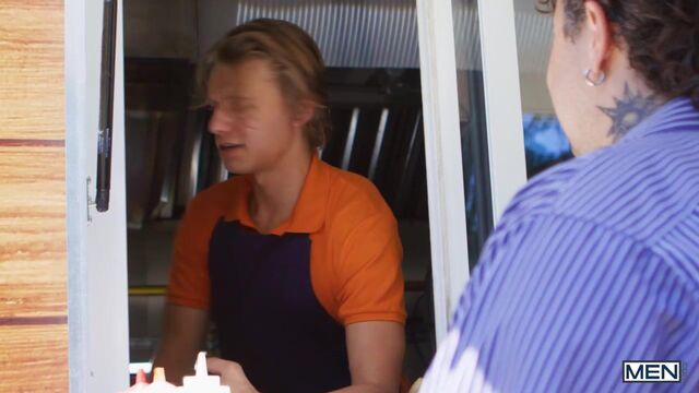 Thick Angel surprises food truck employee Leo Louis stroking his sausage and watches the blond hunk cum on a hot dog, and he wants "That one." The cum-hungry customer happily eats the dog, then finds Leo's note, so he bails on his friend and goes around back where Leo's waiting to give him a taste of his wiener! Leo pounds the bottom doggystyle, and they go into the food truck where Thick Angel rides him on the floor. The thick bottom bends over the counter to get fucked, then takes Leo's dick on the floor till he orgasms before it's time for another taste of the top's cum!