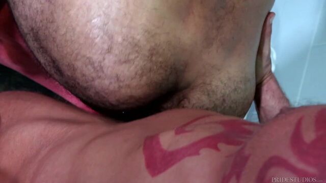 After a good, hard workout, Tristan Brazer and Rikk York decide to rinse down in the shower, but when they find it empty, Tristan looks for a little post-workout play. Rikk is always down to fuck, but he's worried about getting caught. Tristan laughs and tells him the danger of getting caught is half the fun, and Rikk can't argue with that, especially when Tristan is already down on his knees with his lips wrapped around Rikk's cock. He presses him up against the side of the shower and eats his hole before plunging his cock deep inside. Rikk tries to keep his voice down, but the feeling of Tristan's pounding cock has him pulsating and singing at the top of his lungs. He no longer cares if anyone sees them, as long as Tristan keeps fucking him. Tristan does his best to hold out, and he lasts just long enough to fuck the cum out of Rikk before shooting his load all over his hairy stomach. Lucky for cum covered Rikk, the showers are still empty for him wash away the evidence.Enjoy!