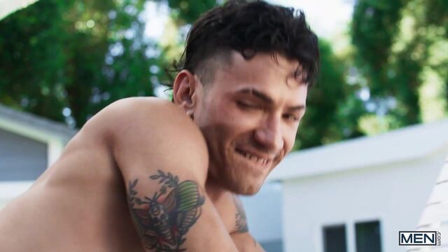 It's a perfect day for Rocky Unleashed to lounge poolside with a good book... until short king Siren Santiago's cannonball splashes him and ruins Rocky's reading material. He tells Siren to be more careful and lifts him out of the pool, and Siren gets to his knees to suck the tall top's big dick. Rocky fingers and tongues the bottom's hole, then teases him with strokes between his cheeks until Siren's begging for that cock before giving him what he wants. Siren rides the top, and Rocky lifts the tattooed cutie for a stand-and-carry, then drills him on his back on the lounge chair. They fuck in the pool till Rocky fills the bottom with cum, and Siren jacks off till he orgasms.