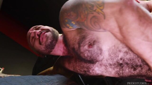 Julian Torres has to bond with is new stepson Scott DeMarco but he's not sure how. Julian's wife has called him to tell him that Scott is on the way to his shop so they can figure something out. Scott arrives and at first they have no idea what to do and neither one of them have any common ground until Scott mentions sucking cock and soon after Julian is down on his knees servicing Scott's big dick. Scott face fucks him until he bends him over and pushes his bare cock deep into Julian's ass. Julian gets fucked in the autobody shop until they both cum all over the place.