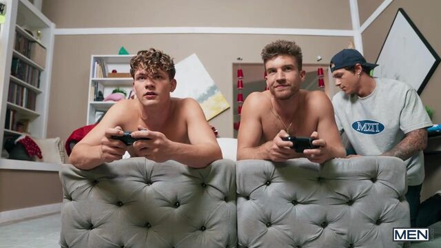 Not only have Oliver Marks and Carter Collins left the frat house a huge mess, they completely ignore Jayden Marcos when he asks them to clean up, not even looking up from their video game. Jayden tests their focus by putting his cock in their faces, their mouths, and even in their holes, and the guys still don't stop playing for a second! Frustrated, the top finally turns off the game and tells the bottoms to suck him. Oliver gets on top of Carter so Jayden can fuck them back and forth, then the guys form a train. Oliver and Jayden hoist Carter between them as the horny bottom takes Jayden's cock, then curly-haired Oliver rides Jayden and sucks Carter. The guys swap spots till Carter cums as Jayden drills him on his back, and Oliver and Jayden shoot hot loads all over him!
