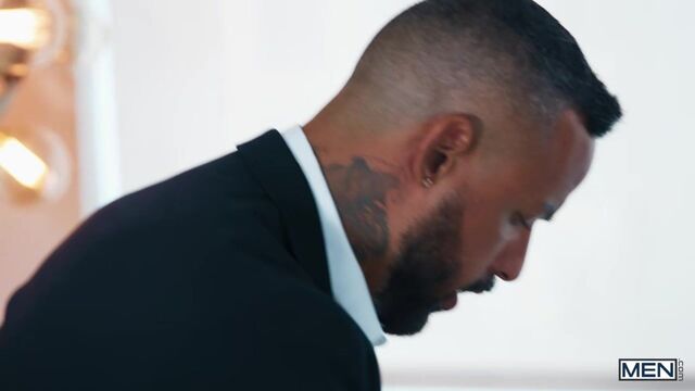 From the way his boss's son has been flirting and hinting, Jona Ortiz knows that when he visits the head office, they'll be closing the deal. He's shown into Ari Yummey's office, and the hairy exec makes his agenda clear, so Jona pushes him down onto the conference table. The guys kiss and undress each other and Jona rims the bottom, then slides his cock into that hole. Ari sucks the top and takes his dick on the floor before riding the tattooed hunk. Jona fucks Ari in doggystyle and seals the deal with a facial.