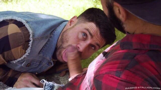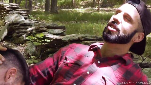 After a hard day of cutting firewood, the humble and rugged inhabitants of 'The Territory', Beau Butler and Romeo Davis, take a break on a pile of rocks where Romeo unzips his pants to let Beau deepthroat his uncut cock. Now that Romeo's meat is fully stiff, he lays back so Beau can stand over him while he eats Beau's hole. Romeo makes sure to lick every inch of Beau's hairy hole before spinning him around, so Beau can sit on his throbbing dick. The mountain men take a break from fucking bareback to 69 on the bench before Beau bends over and gets stuffed with some more of Romeo's massive trunk. Switching positions one last time, Beau holds his leg up while Romeo stretches his ass so wide it makes Beau shoot a creamy load that Romeo rushes to lick up. Beau drops to his knees one last time to catch Romeo's load that shoots from his cock and into Beau's mouth. Has this attraction distraction allowed for some unwanted visitors to invade 'The Territory'?
