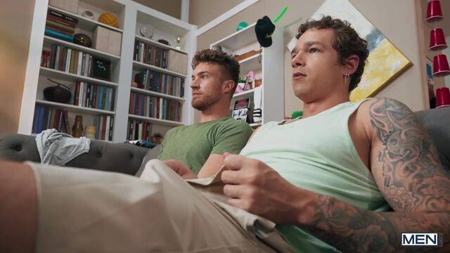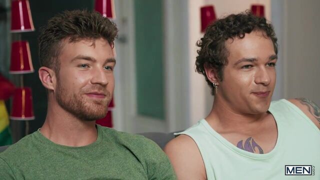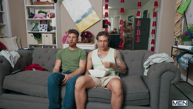 Jayden Marcos's girlfriend isn't a huge fan of how his roommates are always cockblocking them during their dates in the frat house. A wrong move leads to the right one as frat bro Carter Collins reaches for the popcorn and puts his hand right on Jayden's bulge! Jayden's not mad; he takes out his cock and Carter sucks it while the GF is in the other room. The top sneakily fucks Carter from behind in the kitchen, not even stopping when his girl catches them and storms out. He pounds the bottom on the floor, and Carter rides Jayden on the couch, then cums as the top drills him on his back. Jayden pulls out and blows his load!