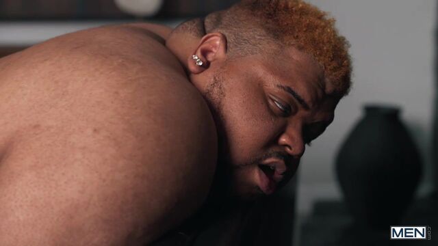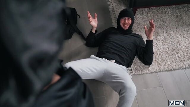 Santana XXL hears a disturbance and gets out of bed to investigate. When he catches burglar Jack Hunter red-handed, the startled criminal falls to the floor. He's a huge fan, so Santana pins him down by sitting on his face! The guys 69 and Santana sucks the hung housebreaker, then takes that dick in missionary before tittyfucking it. Jack pounds the bottom on the couch in doggystyle, then cums on his face.