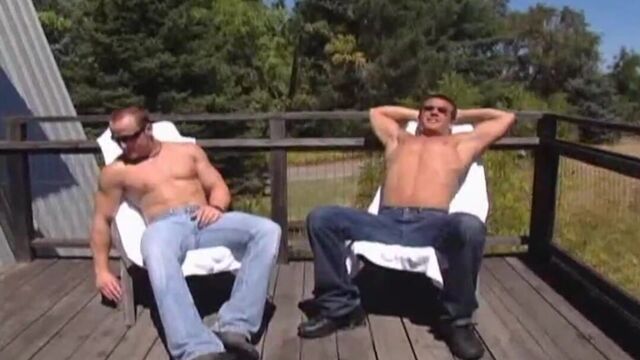 Kenny and Marcus were hanging out the other day, throwing the football around. After a bit of catch, the two headed over to the deck where they had the lawn chairs set up and a few cold brews waiting for them. When Kenny was coming back outside after taking a leak, he found Marcus with his pants down. Surprised, but not appalled, Kenny takes a seat next to his buddy and goes with the flow; dropping his drawers and yanking on his cock as well. The two sip their brews and jerk off until both of them drench themselves in their creamy white man milk. That's always fun! Enjoy!