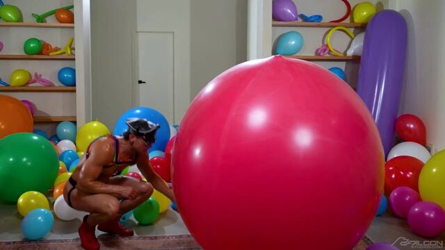 As soon as dom daddy Quin Quire hangs up on Danny Fantasy, he turns all his attention to Seth Peterson. After removing Seth's ball gag and popping the massively oversized balloon that was swallowing the twunk's muscular body, Quin begins stuffing Seth's mouth and ass with his big hard dick. The squeaking sounds of rubber latex and popping balloons fill the room as the looners grab hold of the surrounding balloons and fuck bareback atop several humongous inflatables until Quin is rubbing a cum-covered balloon all over Seth's face.