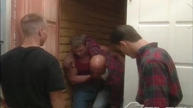 Having successfully escaped prison, Addison Scott and Caesar stop at Matt Skyler and Cameron Fox's home, pretending to be injured hikers. Cameron ushers Caesar off to show him his quarters while Addison corners Matt in another room. The muscled thug subjects Matt to an intense session of rough-housing and sexual indignities. As it turns out, Matt is receptive to all this brutal punishment. He willingly submits to all of Addison's demands. Matt complies with every order the mean fugitive barks out - sucking his hard, thick prick, spreading his asshole wide for ficking, getting slapped and spat upon. Addison gags Matt, slides his fingers up the blond's ass, rfims him a bit, then plows him hard and fast until he finally unloads, spraying his load all over mat. Soaked in spunk, Matt strokes himself off and adds to the hot sticky mess.