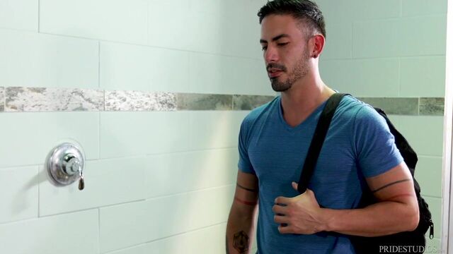 Scott DeMarco and Jack Andy are sitting in the locker room showers looking at the mobile phone when they discover that they have both been talking to the same guy on the hook-up app and he is in the gym. They invite him to join them in the locker room and while they wait, they start stroking their big cocks and making out. While they are making out, Cesar Rossi appears in front of them and he is pleased with what he sees. He drops to his knees and starts sucking both of their cocks. Jack then starts sucking Cesar's cock while Scott rims his hot ass. Scott then starts fucking Cesar while Cesar sucks Jacks cock. Jack and Scott then switch places and continue to spit roast Cesar. Cesar then lies on his back and Scott fucks him until he cannot hold back and shoots a nice thick load of cum all over himself. Jack then shoots on Cesar's chest