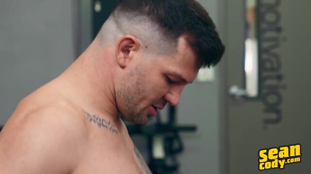 Brysen and Ryan get talking about their workout routines in the gym, and Brysen is ready to get his pump on. The tattooed top pulls down Ryan's shorts and rims his hole, then starts fucking him from behind. Ryan sucks Brysen and sits on his dick, then takes it deep as Brysen lays him on his back on a balance ball. Brysen fucks the cum out of Ryan and uses it as lube to pump his dick and jack himself off!