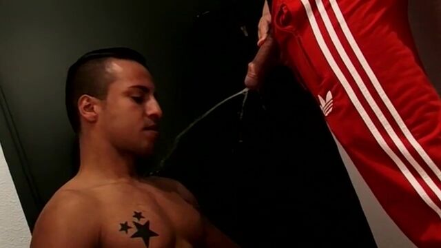 - Description: After being beckoned into the building he's quickly on his knees and taking a flood of hot piss all over his muscled body as his friend splashes all over him. That big meat is soon being sucked and serviced, but he needs it up his ass too. With some rimming and fingering to stretch him open he takes a hard fucking right there on the stairs, finishing up splashed with a massive cum load!
