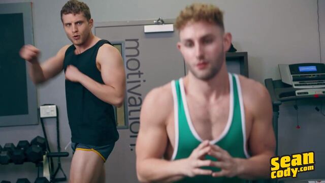 Check out Jackson's ass as he gives a tutorial for some great glute exercises with the resistance band. The curly-headed hunk emphasizes the importance of tension as he does squats and fire hydrants, and Kieran shows off with some shadowboxing as he keeps an eye on the bottom's booty. The guys start making out, and Kieran strokes Jackson's boner through his singlet, then undresses him and jacks him from behind before bending him over a box to tongue his hole. Jackson takes the top's cock in doggystyle and missionary, then sucks Kieran before sitting on his dick until he cums. He gets on all fours and begs for that load on his ass, and Kieran's happy to oblige!