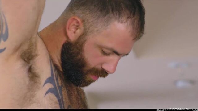 Bearded stud Jake Nicola is ecstatic to discover a completely naked Beau Butler waiting for him in bed. The hairy hunk quickly disrobes and immediately starts to rim Beau's furry ass. With Jake's daddy dick now stiff as a board, Beau squats onto his meat and moans louder with every inch that enters his hole. The tattooed top begins to break a sweat as he holds Beau's arms behind his back and continually thrusts himself into Beau's insatiable, muscle ass. A few more bareback pumps into Beau has Jake busting his load inside of the beefy bottom and breeding his ass right before Beau unloads his own balls over his hairy body. Jake then pulls out of the stud's ass just in time to play with the fresh cream that Beau's pushing out of his cum-coated insides.