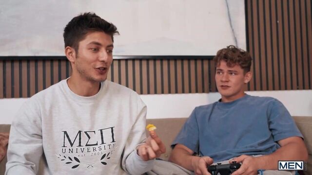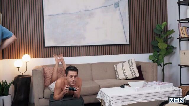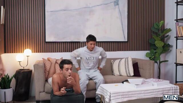Oliver Marks is annoyed by his and Joey Mills' third roommate Angel Rivera trying to grab the video game controller and double-dipping snacks, but he doesn't know that both he and Angel are fucking Joey! The cum-hungry bottom is happy to swallow loads from both roommates and take a creampie from Oliver on the couch. Angel brings Joey to his room to fuck him on the bed, and after Joey cums as he drills him in missionary, he gives him a facial... just as Oliver walks in to catch Angel double-dipping yet again!