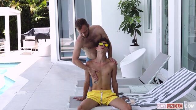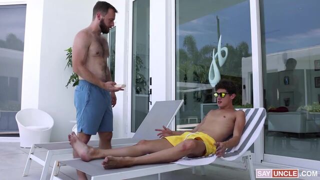 Boy, a nice summer getaway with your stepdad before leaving for college sure is fun! It’s the perfect moment to relax by the pool, and get some nice vitamin D. Yet, Peter, Andy’s caring stepfather, can’t let him be reckless and burn his soft skin, so he decides to rub some sun cream over his boy’s smooth body. A little rub here and there makes the two too comfortable all of a sudden, turning the whole chill moment into an intense fuck session.