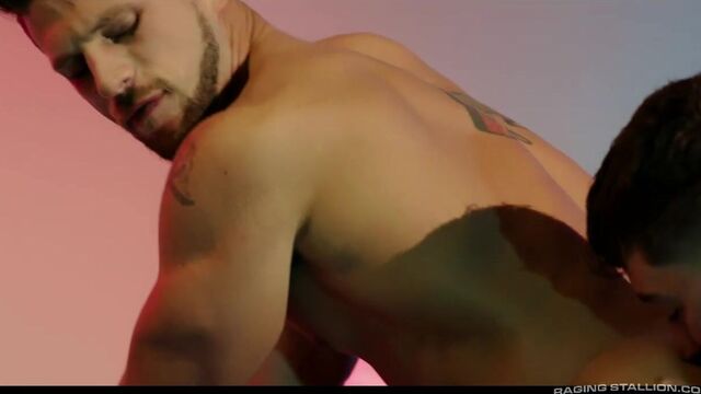 Roman Todd is already soaking wet, soaped up, and rock hard when Chris Damned walks in on him in the shower. When he can't resist the temptation of Roman's soaked, god-like figure, a fully-clothed Chris walks into the shower and begins exploring Roman's naked body. Chris slowly removes his drenched clothes as Roman swallows every single one of Chris' girthy eight inches. Now on a bed with his face shoved in the sheets, Roman loudly moans as the dominant top spits on him and barebacks his wet hole. Chris's XL cock continues to destroy Roman as the muscle bottom lays on his back and covers himself in a hot coat of jizz. That's when Chris pulls out and adds his own load to the sea of seed that's covering a completely drained Roman.