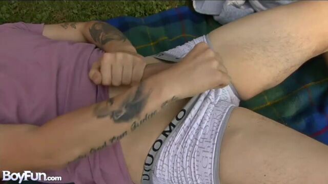 Joshua Czech cums all over his belly in the backyard - Boyfun