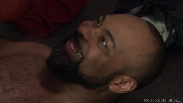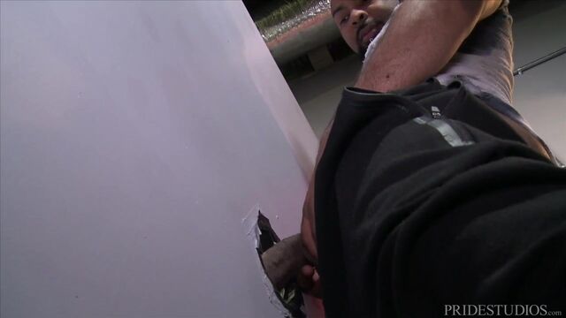 Ray Diesel is in the bathroom hoping to utilize the glory hole as he is pleasuring his enormous cock through his shorts. He pulls it out and as he is stroking it we see someone has entered the bathroom and is taking notice through the glory hole. When Chandler Scott looks through the hole and sees that massive cock his mouth starts watering as he licks his lips and starts sucking on Ray's cock. He services him through the glory hole for a while and then Ray comes out of the stall and continues to feed his big cock to Chandler's eager mouth. Ray then bends Chandler over the sink and rims his ass. Once his ass is nice and wet, Ray stands up and starts fucking him with his huge cock. With each thrust, he gets deeper and deeper into Chandler's ass. Ray then lies on his back on the floor and Chandler rides his big cock. As he rides it, he cannot hold back and he shoots his own cum all over Ray. Ray pulls out and Chandler has him shoots his load all over his face and beard.